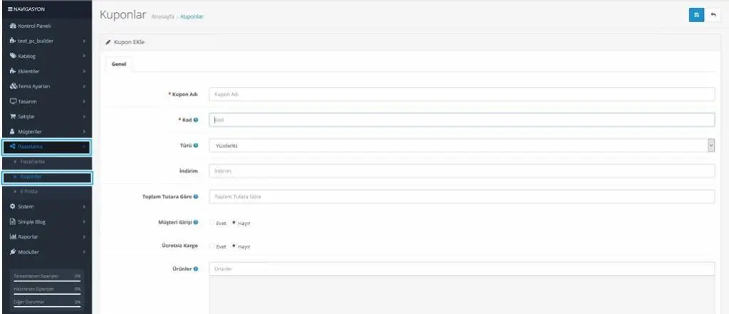 Pazarlama sekmesine tıklayınız ardından kuponlar sekmesine tıklayınız.