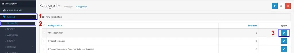 Opencart admin panelinize giriş yapın. Nagivasyon menüsünden katalog ardından kategorilere tıklayın. Ardından sıra belirlemek istediğiniz kategorinin yanındaki mavi düzenle butonuna tıklayın. Eğer yeni kategori ekleyecekseniz sağ üst kısımdaki + işaretli butona tıklayın.